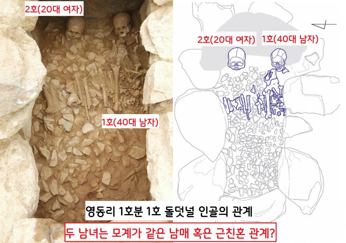 2005년 발굴된 나주 영동리 1호분 1호 돌덧널의 두 인골. 애초에는 강력사건으로 신고되었지만 1500년전 고분으로 밝혀졌다. 분석결과 두 인골은 모계가 같은 남매 사이인 것으로 분석됐다. 만약 부부합장묘라면 근친혼 관계일 수도 있다.|동신대 영산강 연구문화센터 제공