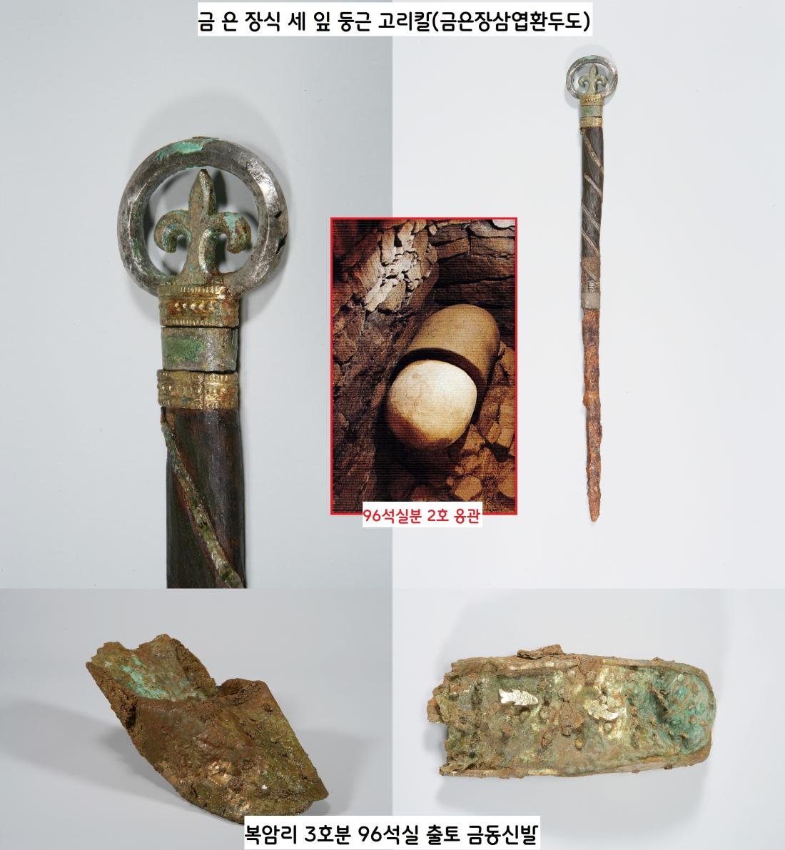 96식실 출토 금은장식 세 잎사귀 둥근고리칼과 금동신발. 복암리 3호분 96석실이 1500년전 영산강 유역을 다스리던 수장이었음을 웅변해준다.|국립나주문화재연구소 제공