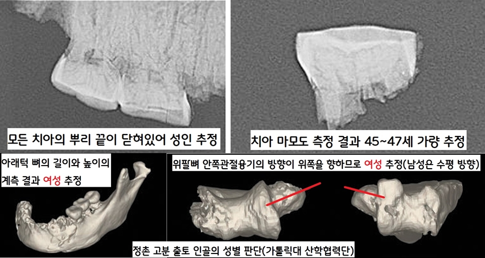 이 수치를 한국인의 아래턱뼈를 이용한 성별판별 공식에 대입해보니 ‘여성’으로 판별됐다. 이는 위팔뼈의 앞면을 바닥에 놓고 위팔뼈의 아래면을 관찰할 때 안쪽관절융기의 방향이 바닥면과 수평을 이루면 남성, 위쪽을 향하면 여성으로 추정하는 방법이다. 3차로 안장된 여성의 경우도 같은 방법으로 분석한 결과 여성으로 판단됐다. 두 인골의 치아 상태로 측정한 나이는 45(3차 주인공 여성)~47세(1차 주인공 여성) 정도로 측정됐다.