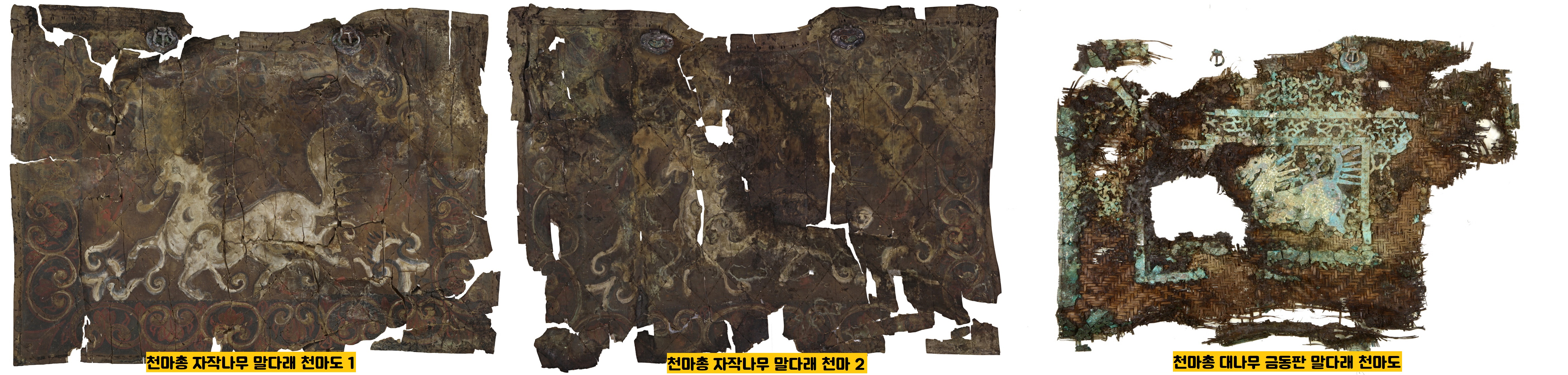 천마총 발굴 당시에는 말다래 3벌(6장) 가운데 ‘자작나무 말다래’ 2장에서만 ‘천마도’가 보였습니다.