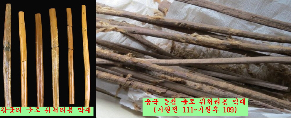 구덩이 안에서 윗부분을 약간 둥글게 만든 나무막대 6개가 출토됐습니다. 조사단은 글씨가 새겨진 명문 목간이 아닐까 기대했습니다. 그러나 아무리 봐도 글자의 흔적은 없었습니다.