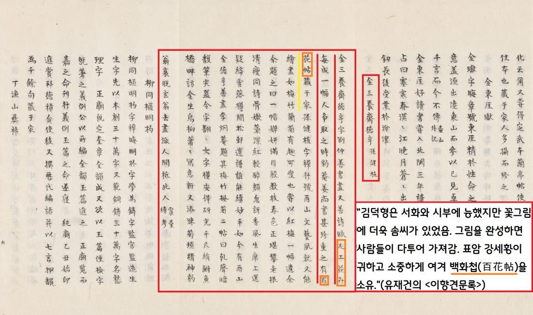 당대의 인물인 박제가가 언급한 ‘백화보’의 ‘김 군’이 바로 강세황의 ‘백화첩’ 작자인 ‘김덕형’임을 알 수 있다.