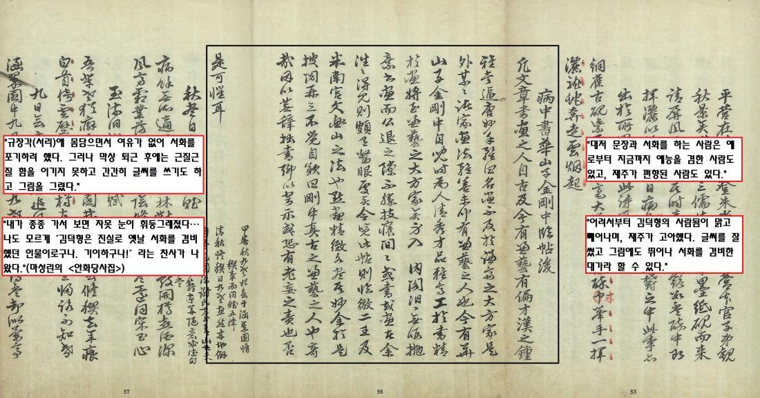 “김 군을 보고 미친놈 혹은 멍청한 놈이라며 비웃고 조롱하며 욕하지만…김 군은 만물을 스승으로 삼고, 기예는 천고(千古)의 사람들과 견줄 수 있다. 김 군이 그린 ‘온갖 종류의 꽃(百種之花)’은 역사에 길이 남을 공적…향기의 나라에서 배향하는 위인으로 삼기에 충분하다…”