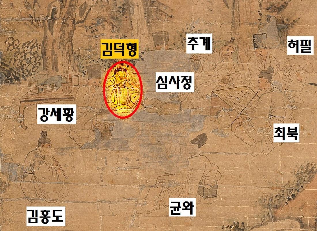 “책상에 기대어 거문고를 타는 사람은 표암 강세황…옆에 앉은 아이는 김덕형…옆에 앉아 있는 이는 현재 심사정…검은 망건을 쓰고 바둑 두는 사람은 호생관 최북…호생관과 마주하여 바둑을 두는 사람은 추계(미상)이다. 구석에 앉아 바둑을 관전하는 이는 허필…자리에 기대어 비스듬히 앉은 사람은 균와(미상)…균와와 마주하여 퉁소를 부는 이는 단원 김홍도….”