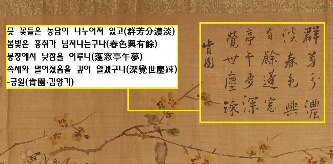 그림의 주인공을 알 수 있는 낙관 등의 표시는 없다. 다만 화폭의 맨 왼쪽에 18세기 예술계의 총수인 표암 강세황(1713~1791)의 화평과 장서인이 보인다. 표암은 “…쓸쓸한 봄날 꽃들이 피어날 때(蕭然春裏開花時) 날아갔다 날아왔다 봄빛을 희롱하네(飛去飛來戱春色)”는 멘트를 남겼다. |정은진 교수 해석