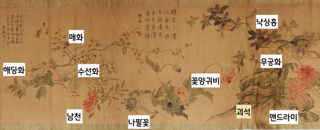 화폭에는 나라꽃인 무궁화와, 맨드라미, 낙상홍, 꽃양귀비, 나팔꽃, 남천, 수선화, 매화, 해당화 등 산과 들에서 흔히 볼 수 있는 꽃이 표현되어 있다. |정은진·박선주 교수 설명