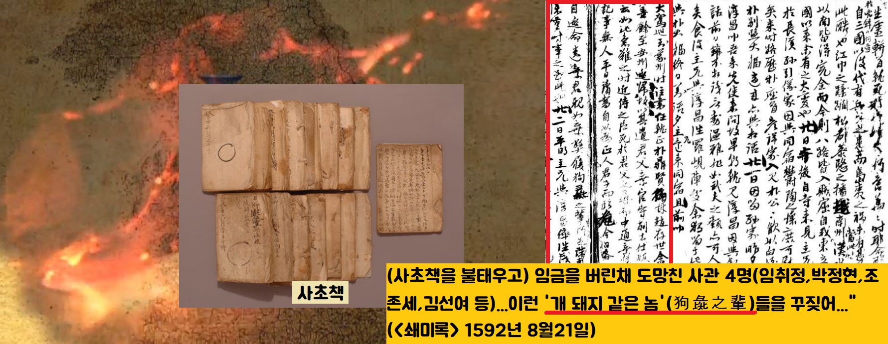 오희문은 선조의 몽진길을 수행하다가 사초책를 불구덩이에 던져넣고 도망친 사관 4명(임취정·박정현·조존세·김선여 등)을 두고 “이런 개돼지 같은 무리를…”(1592년 8월21일)라고 욕했습니다.