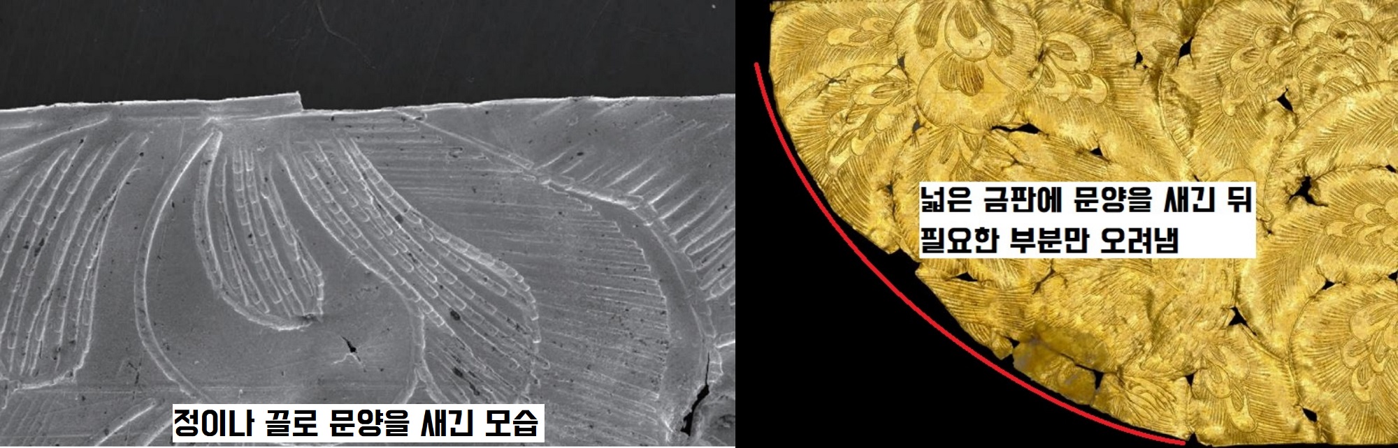세부 문양을 살펴볼까요. 넓은 금판에 문양을 새긴 후에 필요한 부분만 오려 사용했는데요.