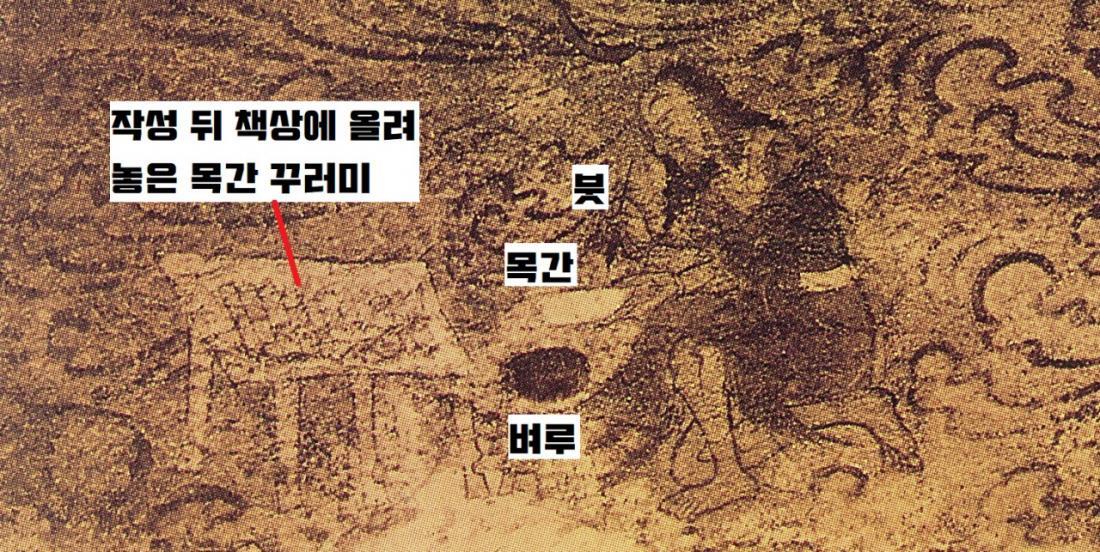 가장 중요한 도구는 붓이다. 1988년 경남 창원 다호리에서 기원전 1세기 무렵 제작된 붓 5점과 ‘삭도(削刀·지우개용 칼)가 출토됐다. 이 붓 5점은 양쪽에 붓털을 끼운 형식이었다. 한쪽만 붓털을 끼운 중국 붓과 다른 독자적인 붓이다.