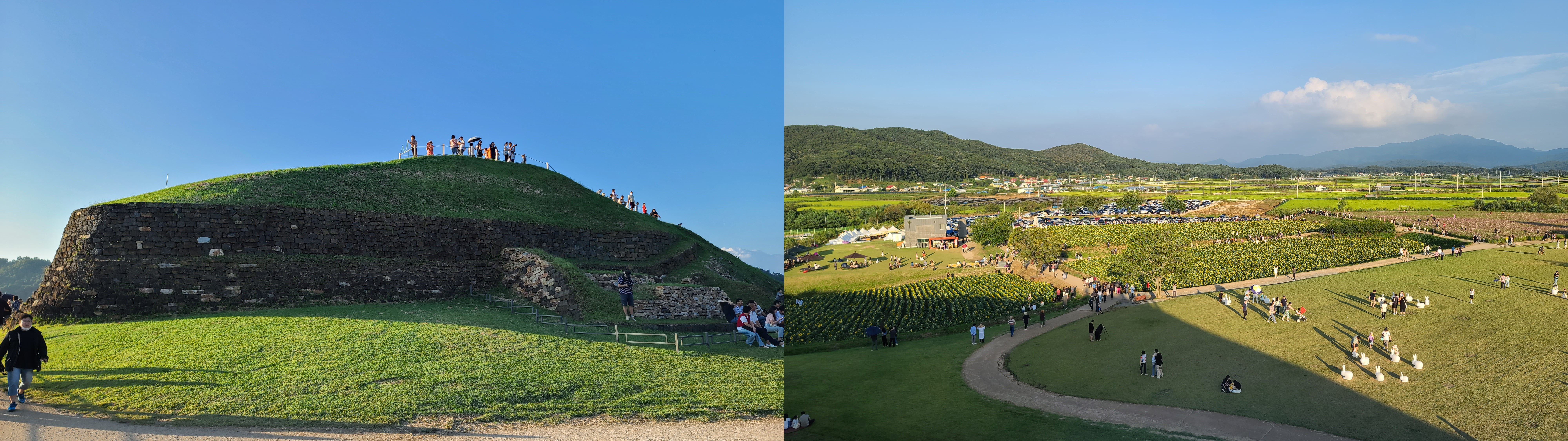 6만송이의 해바라기 밭에서 연신 포즈를 취하고 사진을 찍는 관람객들도 북적댔습니다. 불과 몇 년 전까지만 해도 차 한대가 드나들 수 있는 좁은 도로를 겨우 지나가야 했는데요. 이번에 가보니 산뜻한 포장도로가 새롭게 마련된 주차장까지 뚫려있더라구요.