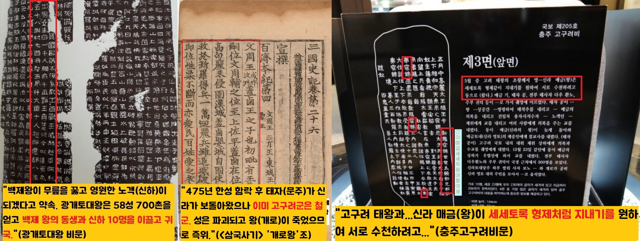 이 대목에서 “~백제왕을 영원한 노객으로 삼고 돌아왔다”는 <광개토대왕 비문>이 눈에 띈다는 겁니다. 또 <삼국사기> ‘백제본기·문주왕’조는 “475년 한성 함락 후 문주왕(475~477)이 신라가 보낸 원군과 함께 돌아와 보니 고구려군이 이미 물러갔다”고 했습니다. 5세기 말에 작성된 충주 고구려비문도 “고려태왕이 신라 매금(왕)과 (더불어) 세세토록 형제와 같이(如兄如弟)…화합한다”는 구절이 있습니다.