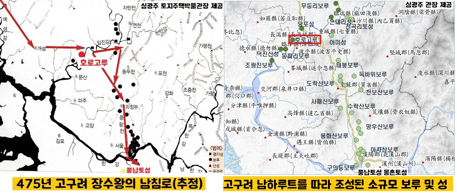 <삼국사기> 등에는 기록되지 않았는데요. 475년(고구려 장수왕 63·백제 개로왕 21) 장수왕이 이끄는 고구려군의 남침로도 바로 바로 이 호로하와 칠중하 쪽이었을 것으로 짐작됩니다. 1950년 한국전쟁 때 북한군이 개성-장단-파주-고양루트를 선택하지 않았듯, 호로고루 쪽이야말로 고구려 주력인 기마병 부대가 건널 수 있는 여울목이었을테니까요.