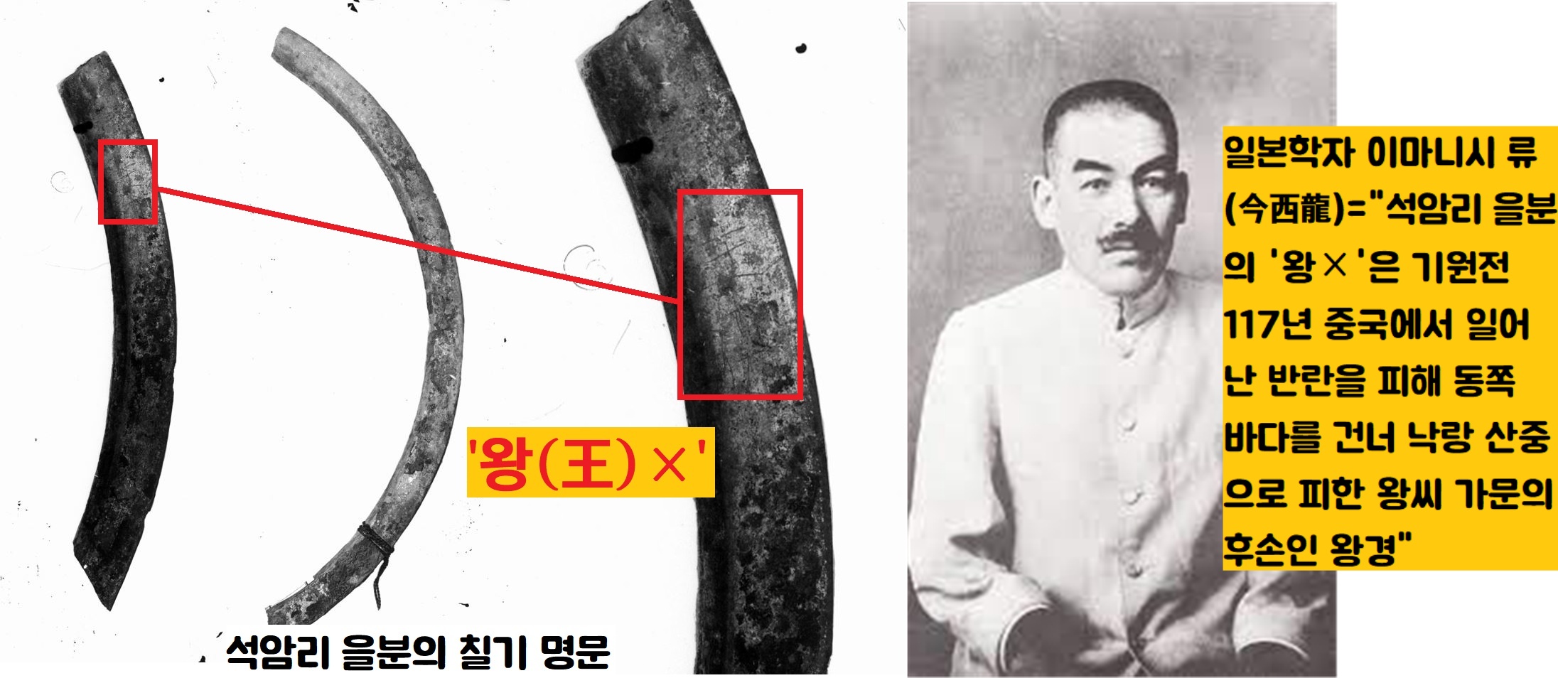 그러나 2년 뒤(1911년) 이마니시 류가 입장을 바꿉니다. 자신이 발굴한 석암리 을분에서 나온 칠기 부품의 ‘왕(王)×’ 명문을 중국인인 ‘낙랑 왕씨’와 관련시킨 겁니다. ‘낙랑 왕씨’는 <후한서> ‘왕경전’에 등장하는 ‘낙랑 남한인=왕경’ 가문을 가리키는데요.