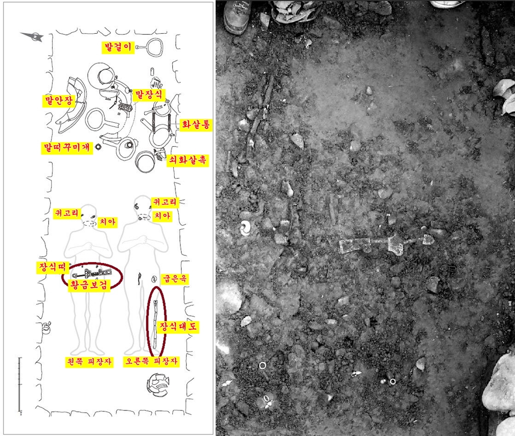 물론 나란히 누운 두 남자의 신분은 차이가 있었을 겁니다. 오른쪽 피장자(대도)보다 황금보검을 지닌 왼쪽 피장자의 신분이 더 높았겠죠.