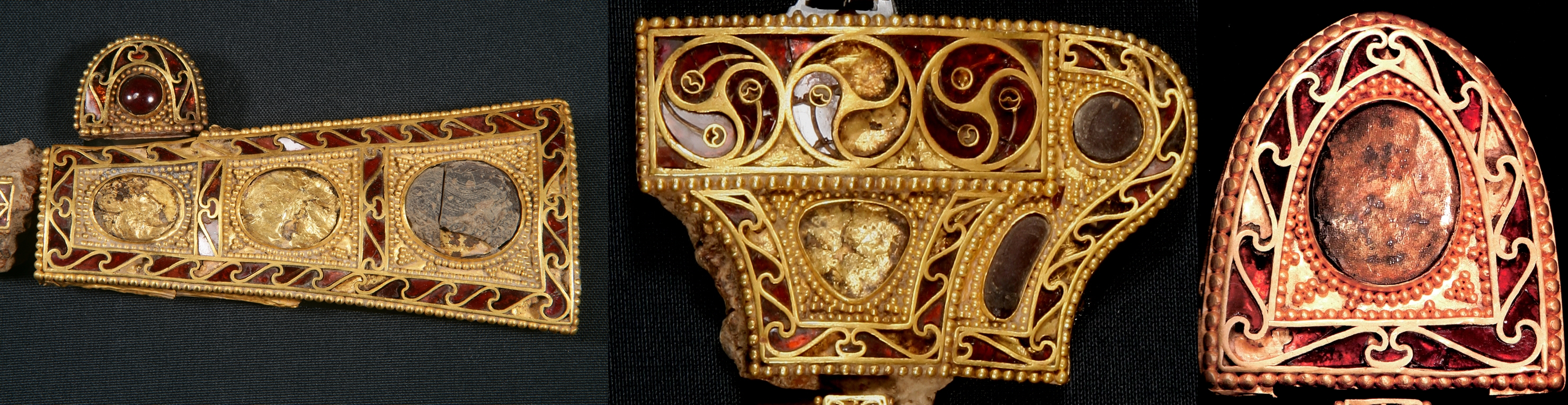 황금과 붉은색 석류석을 사용한 것은 동로마제국에서 기원한 건데요. 이 기법은 훈족의 발흥과 유럽 침략에 따른 민족 대이동 시대에 유럽전역으로 퍼졌답니다. 황금보검의 제작 기법은 동로마제국 또는 동로마제국의 영향을 받은 유럽의 여러 이민족에 의해 제작된 것으로 볼 수 있습니다.