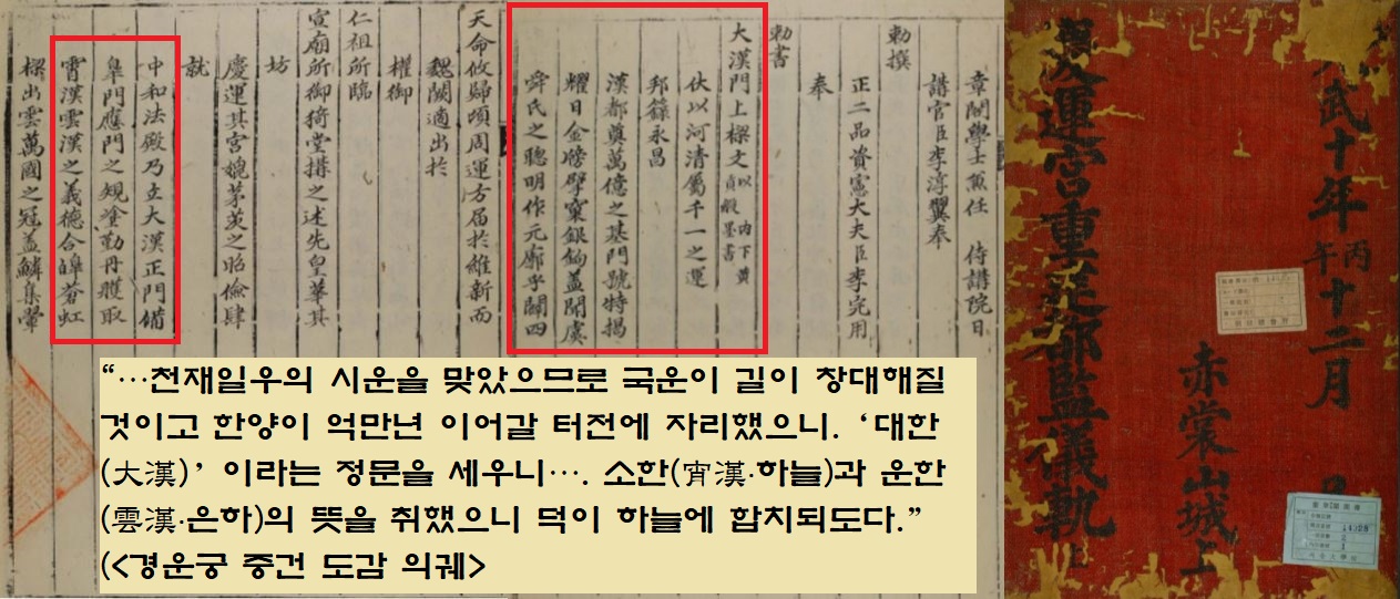 “황하가 맑아지는 천재일우의 시운을 맞았으므로 국운이 길이 창대해질 것이고 한양이 억만년 이어갈 터전에 자리했으니…‘대한(大漢)’이라는 정문을 세운다…소한(宵漢·하늘)과 운한(雲漢·은하)의 뜻을 취했으니 덕이 하늘에 합치되도다.”