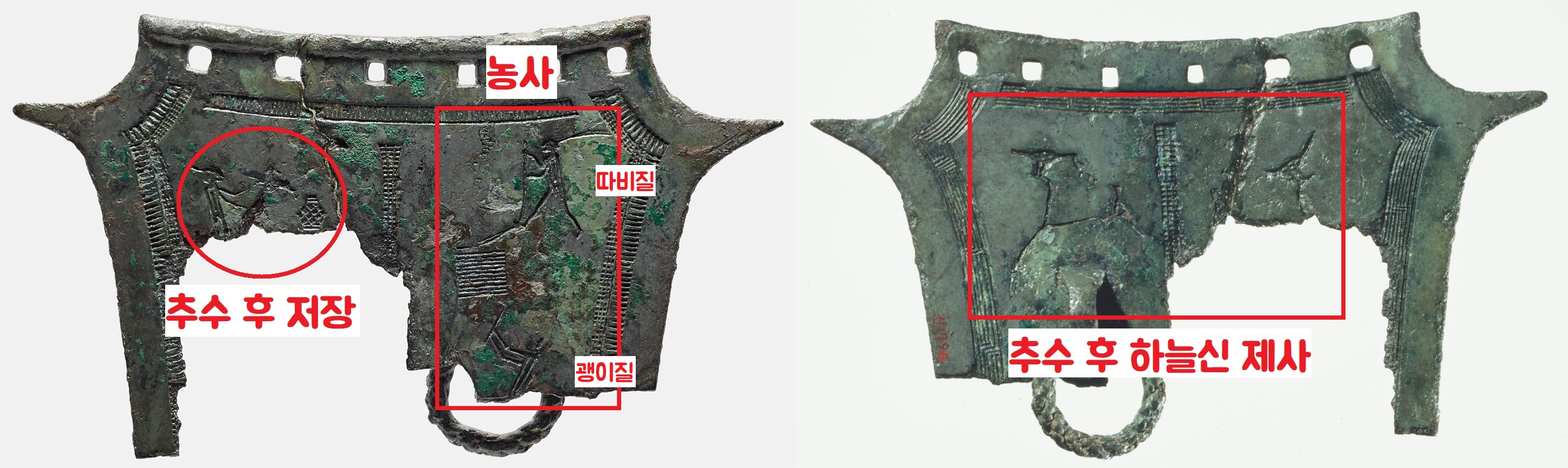 이 청동기에 봄에 씨를 뿌리고, 가을에 추수하는 농경생활을 상징하고 파종 후와 수확 후에 하늘신과 조상신을 위해 제사를 지내는 의식까지 새겨넣은 것이 아닐까요. 손바닥만한 크기로 보아 하늘 제사 때 제정일치의 지도자가 가슴팎에 걸었던 도구였을 가능성이 큽니다. 이후 30년 넘게 농경문청동기는 “기원전 4~3세기 생산의 풍요를 비는 주술적인 의미가 있는 의기(儀器)로 판단된다”고만 해석했습니다.