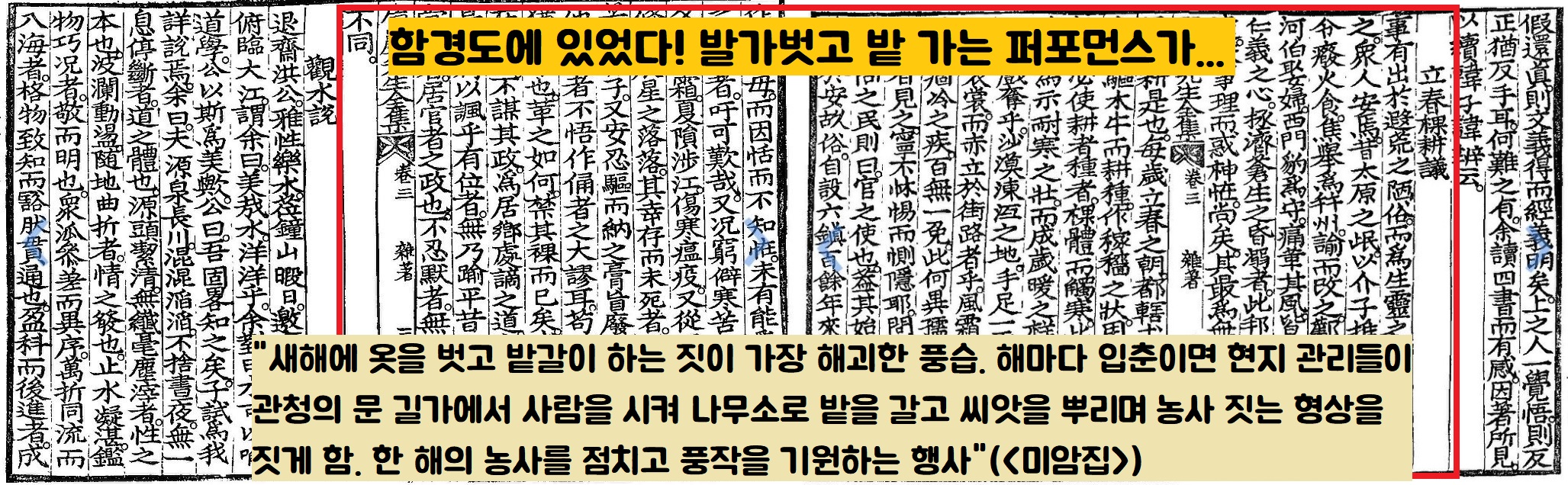 유희춘은 ‘옛 노인들의 말’을 인용하면서 ‘추위를 견디는 씩씩함을 보여주고 그 해 따뜻한 상서로움을 이루기 위해’ 옷을 벗고 밭을 가는 행사를 거르지 않는다고 전했습니다. 물론 유희춘은 이런 퍼포먼스는 반드시 근절되어야 한다고 목소리를 높입니다.