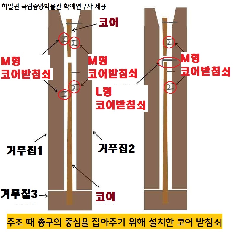 주조 때 이 코어받침쇠가 설치된 채로 쇳물을 붓기 때문에 총통의 기벽 속에 그 흔적이 남아있는다. 총의 길이가 길어지는 조선 중기 이후의 소형 총통에 예외없이 보이는 흔적이다.|허일권 국립중앙박물관 학예연구사 설명