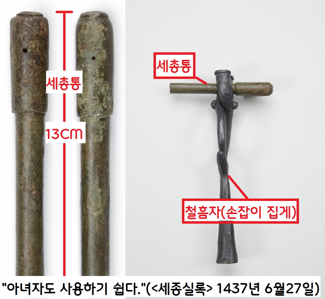<세종실록>은 “1437년(세종 19) 군기감이 만든 세총통(細銃筒)은 (적정을 살피는 정탐꾼은 몰라도) 말 위에서 싸우는 기병에게 매우 편하고, 위급 시 어린아이나 여성들도 쏠 수 있다”(6월27일)고 설명했다.