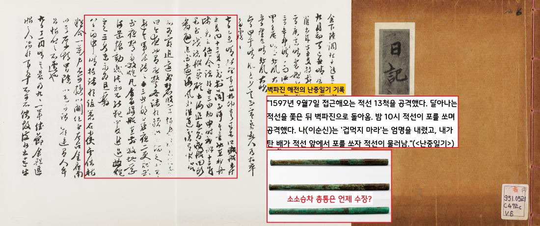 (이 기사를 위해 허일권 국립중앙박물관 학예연구사. 노영구 국방대 교수, 양순석 국립해양유산연구소 유물과학팀장, 이규훈 국립해양유산연구소 수중발굴과장, 최영창 국가유산진흥원장, 장한울 육군박물관 학예담당이 도움말과 자료를 제공해주었습니다.)