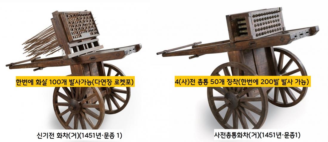 세종의 뒤를 이은 문종 연간(1451년) 개발된 신무기도 있었다. 화약 추진으로 화살 100발을 한번에 쏠 수 있는 다연장 로켓발사기(신기전기 화차)와 사전총통 50개 이상을 장착해서 화살 200개를 동시에 발사하는 사전총통기 화차가 그것이었다.|국립진주박물관 제공