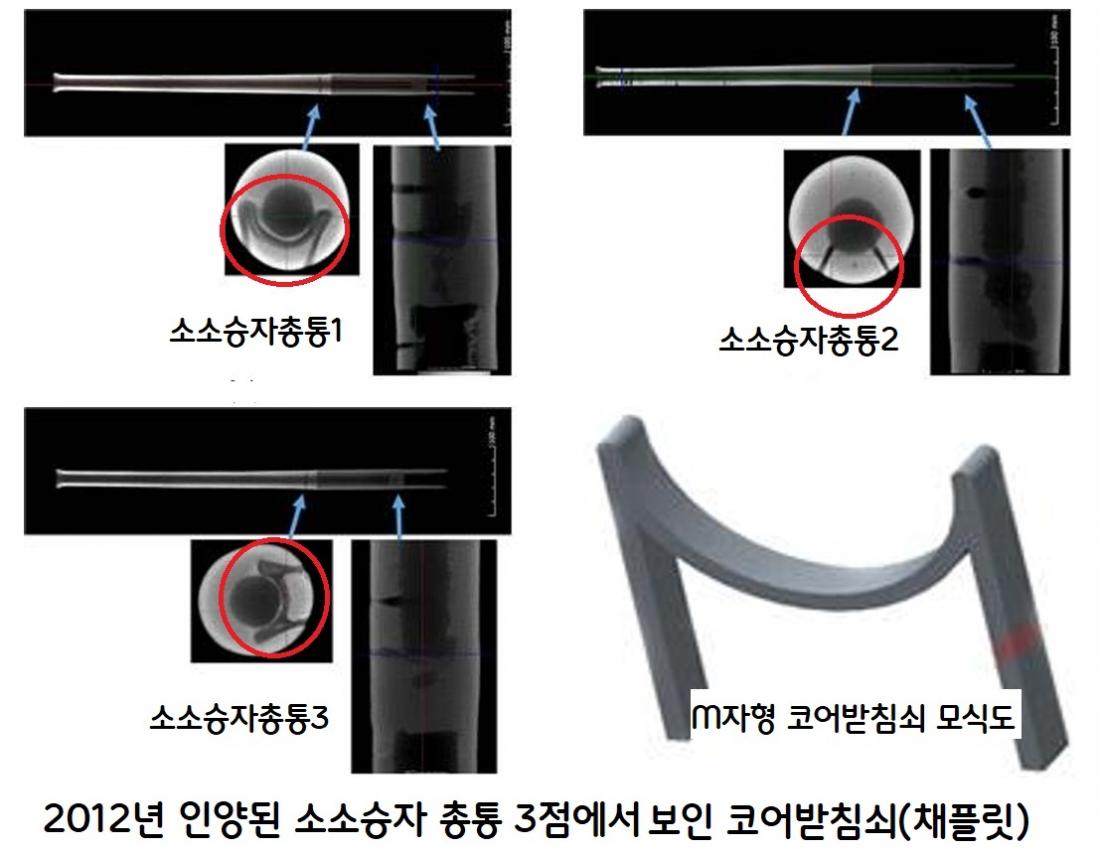 그런데 CT(컴퓨터단층촬영) 조가셜과 인양된 소소승차 총통 3점에게도 그런 코어 받침쇠가 비슷한 위치에서 예외없이 보였다. 가짜가 아니라는 것이다.