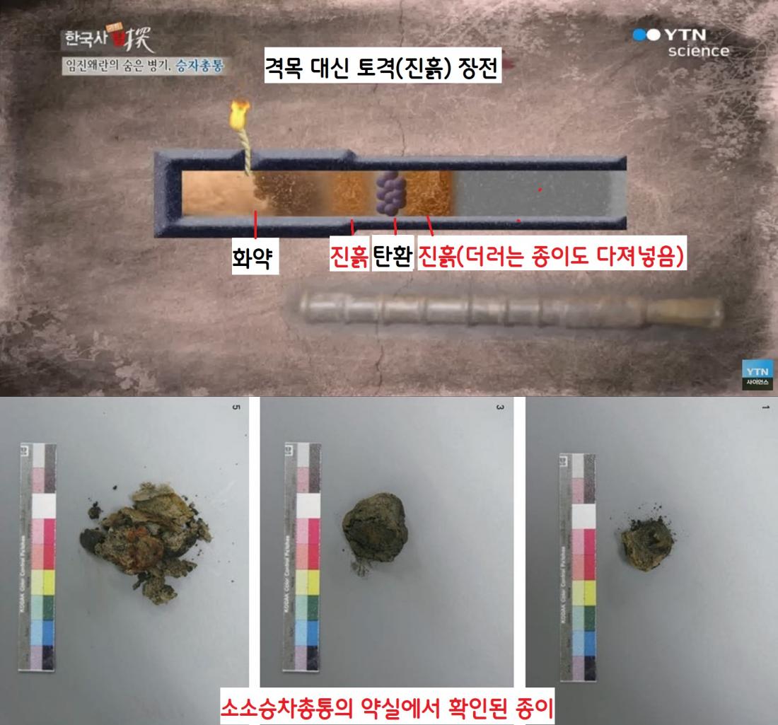조선 전기의 ‘화살전용’ 총통에는 화살추진을 원활하게 만들기 위해 화약과 화살 사이에 격목(나무)을 끼워넣었다. 그러나 김지가 개발한 승자총통에서는 격목 대신 진흙과 종이 등을 탄환과 함께 채워넣었다.|국립진주박물관 제공