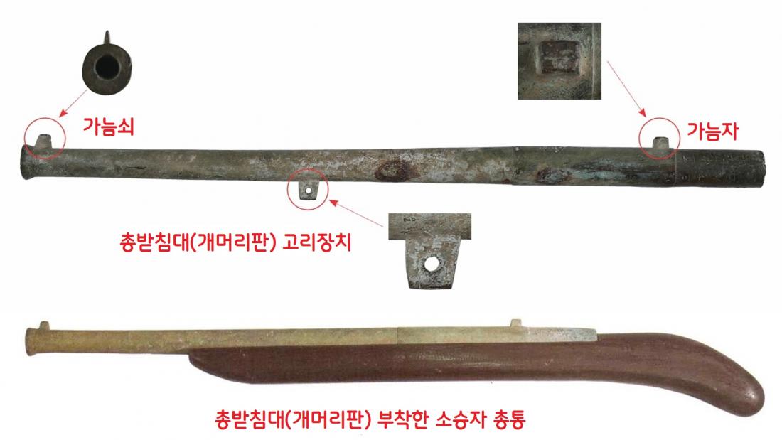 ‘조총의 장점’을 도입한 개량무기가 소승자총통이었다. 가늠자와 가늠쇠가 설치되어 있고, 총받침대(개머리판)을 달아 나름 조준사격을 꾀하려 했다.|국립진주박물관 제공