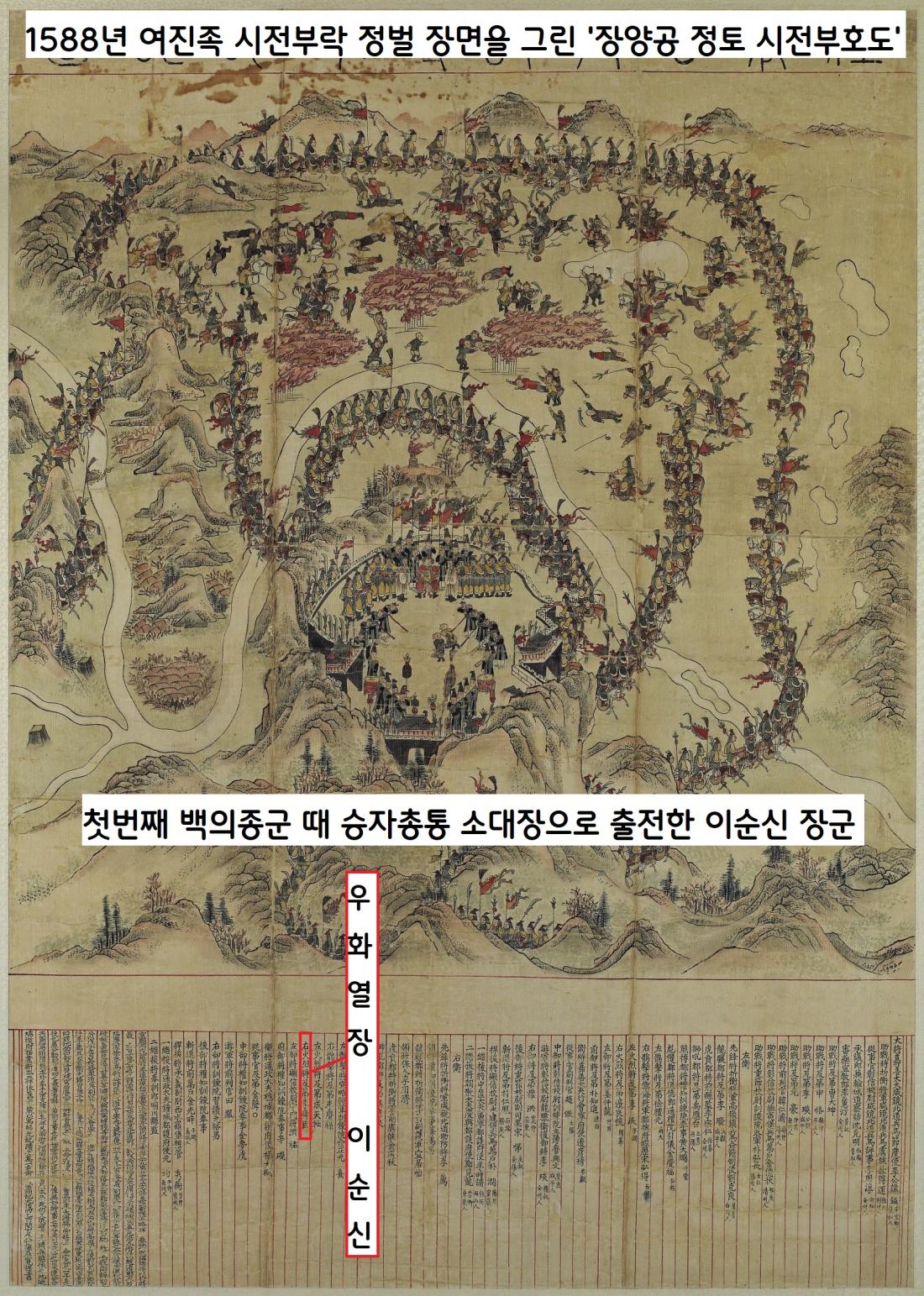 그런데 조선군이 1588년(선조 21) 1월27일 두만강 상류 녹둔도를 점거한 여진의 시전부락을 토벌할 때였다. 이순신은 이때 승자총통 등으로 무장한 소대를 이끌고 참전해 공을 세웠다. 당시의 시전부락 토벌내용을 그린 ‘장양공정토시전부호도’에는 ‘우화열장’ 직함의 이순신 이름이 적혀있다.