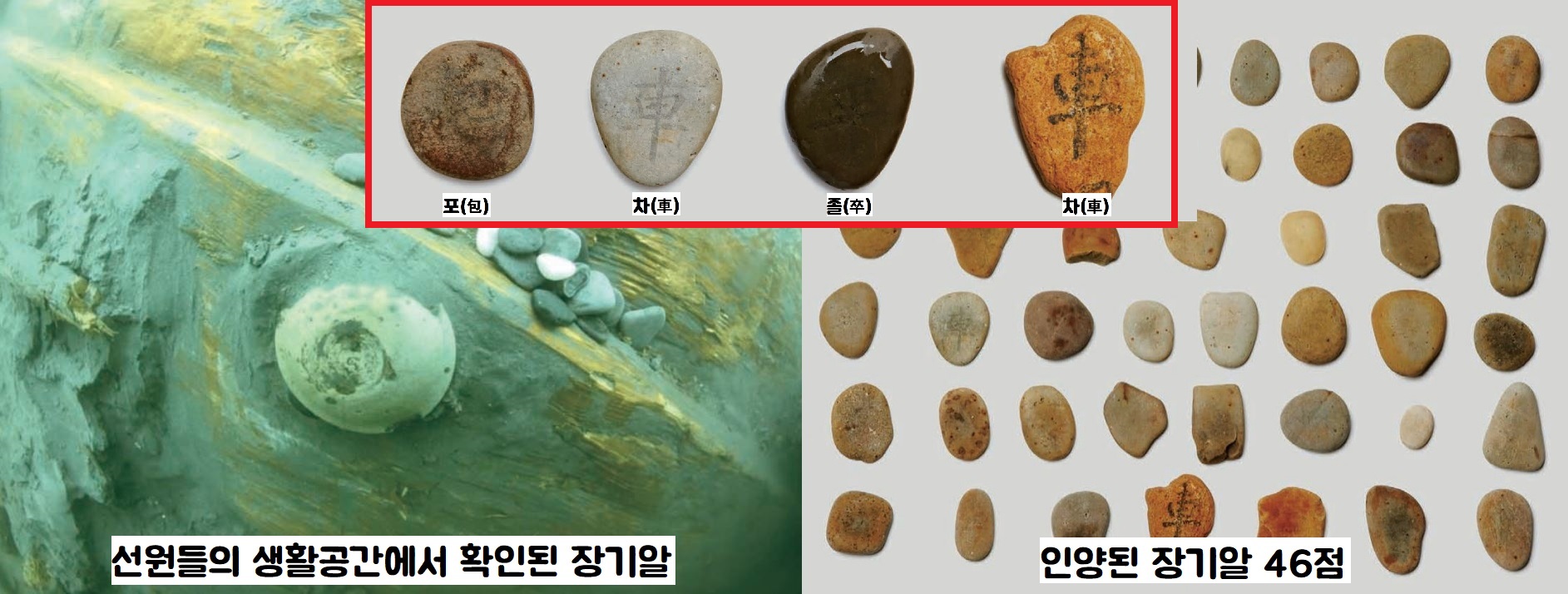 모서리가 둥근 조약돌을 이용해 앞뒤에 차(車), 포(包), 졸(卒) 등을 적은 게 확인됩니다.