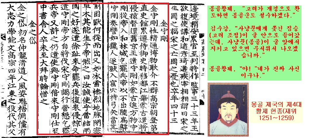 1256년(고종 43) 9월 고려 사신 김수강이 “몽골 군대를 철수시켜 달라”고 몽골 황제인 몽케(헌종·1251~1259)에게 요구합니다. 황제는 “고려가 개경으로 환도하면 몽골군도 철수하겠다”고 거절합니다.