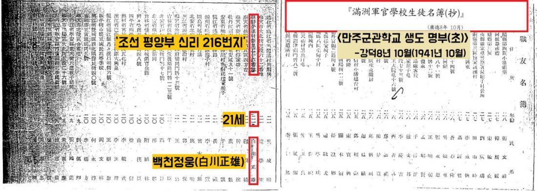 그런데 졸업 직전인 10월 작성된 <만주군관학교생도 명부>(전우명부)에 ‘조선 평양부 신리 216번지, 21세, 백천정웅(白川正雄)’이라 했다. ‘백천정웅(시라카와 마사오)=백선엽’이 틀림없다는게 이용창 위원의 설명이다.