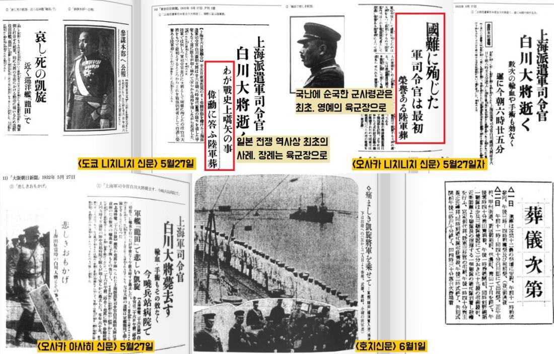 시라카와는 마지막으로 위장과 대장을 절제하는 대수술을 받았지만 5월26일 오전 사망했다. 일본 언론은 “국난으로(일본 전쟁사에서) 군 사령관이 순국한 것은 처음”이라면서 “장례식은 육군장으로 치를 것”(<도쿄 니치니치>·<오카사 니치니치> 5월27일자)이라 전했다. 일본이 윤봉길 의거를 전쟁으로 개념정리한 꼴이 됐다.