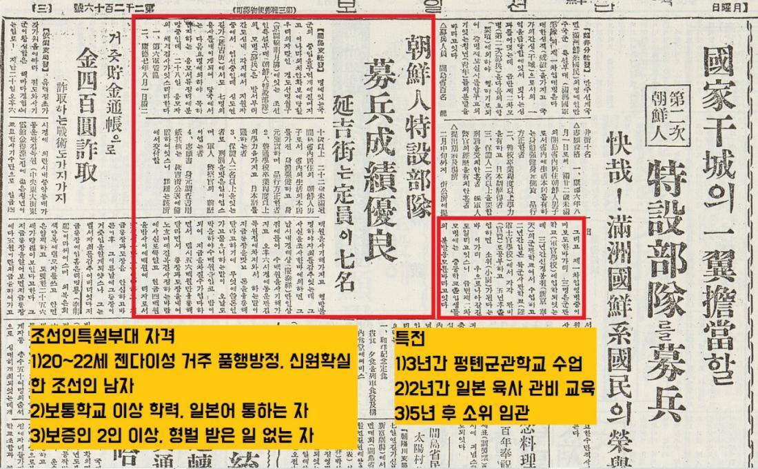 신문이 말하는 ‘국방의 중책’이나 ‘애국의 단충’은 조선(한국)을 위한 것이 아니다. 두말할 것 없이 일본과 일왕을 향한 충성을 뜻하는 것이었다. 간도특설대의 <부대가>를 보라.