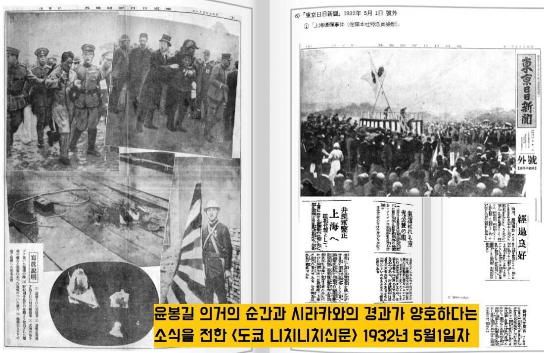 일본은 윤봉길 의사를 가만두지 않았다. 상하이 파견 일본군 고등군법회의는 시라카와가 사경을 헤매고 있을 무렵인 5월25일 윤 의사에게 사형선고를 내렸다. 일제는 그해 12월19일 윤의사의 무릎을 꿇리고 십자가 형틀에 묶은채 총살형을 집행했다. 보복행위임이 분명했다. 그러나 윤의사는 순국하는 그 순간까지도 추호의 흐트러짐이 없었다.