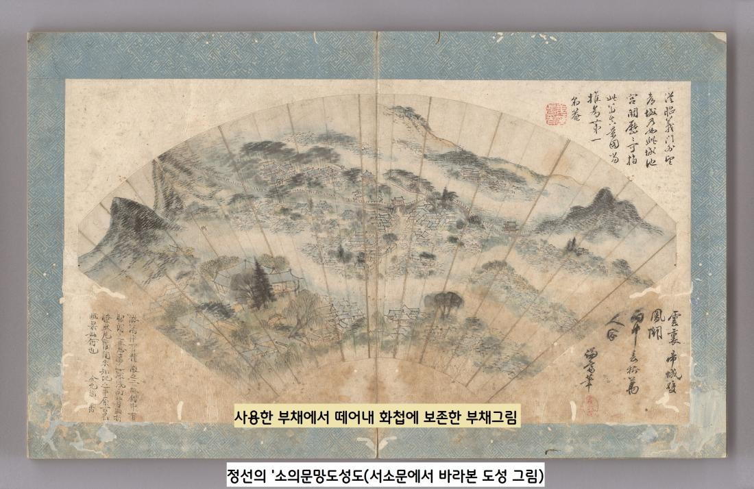 정선의 ‘소의문(서소문)에서 바라본 도성’ 그림. 부채로 사용했다가 떼어내 화첩에 보존한 그림이다. 도성안팎을 한 폭의 실경 산수로 일목요연하게 그렸다.|국립중앙박물관 소장