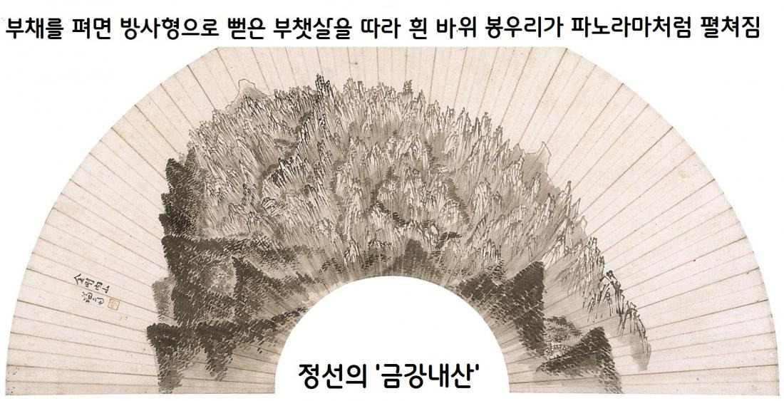정선의 ‘금강내산’과 ‘풍악전면’, ‘정양사’ 등은 결코 ‘소품’으로 여길 수 없는 걸작이다. ‘금강내산’ 부채그림은 펴는 순간 방사형으로 뻗은 부챗살을 따라 금강전도가 드러난다. 그 사이 넓은 여백 아래에서 흰 바위봉우리가 꽃송이처럼 솟아오른다.