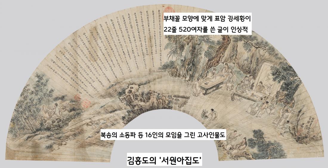 단원 김홍도의 ‘서원아집도’ 부채 그림. 부채꼴 각도가 180도(보통은 140도)에 달한다. 북송의 문호 소동파 등 16명이 모여 문예활동을 펼치는 내용을 그린 ‘고사인물도’이다. 이 그림에는 스승인 표암 강세황의 글이 부채의 모양에 맞게 배치되어 있다. |국립중앙박물관 소장