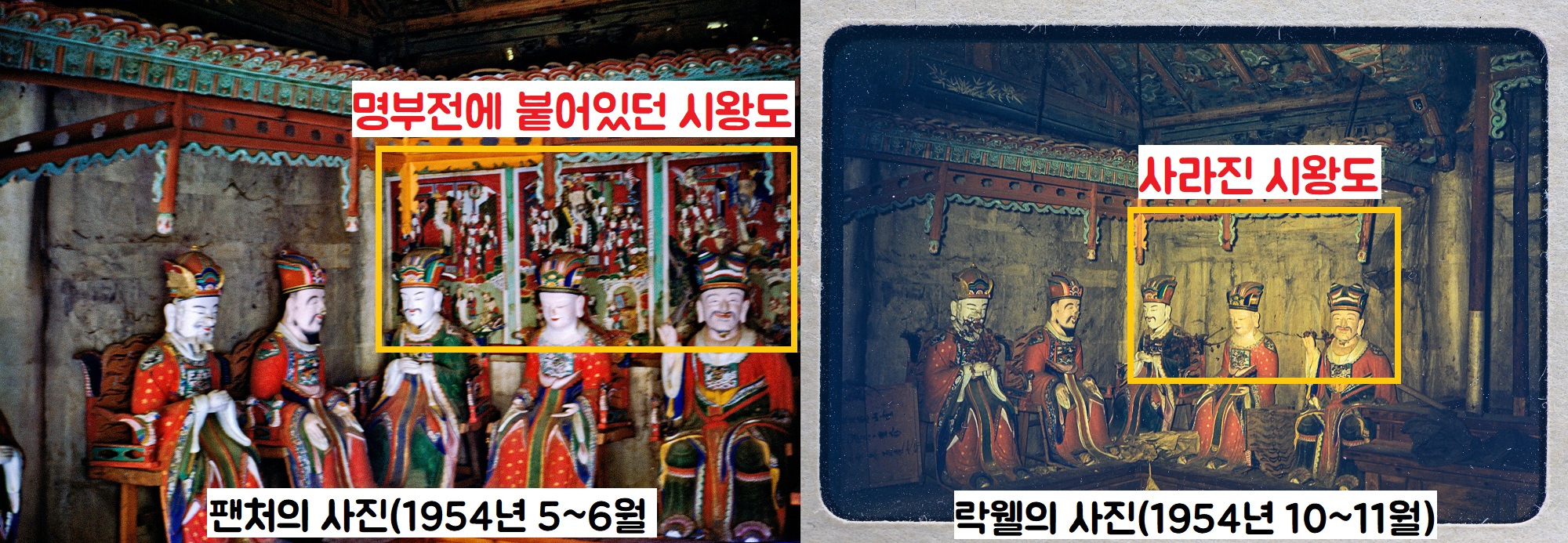 그런데 락웰의 사진에서는 팬처가 촬영한 극락보전에서 보였던 ‘영산회상도’가 사라지고 없었습니다. 역시 팬처의 사진에 남아있던 명부전 속 ‘시왕도’도 락웰의 사진에서는 감쪽같이 자취를 감췄습니다. 락웰은 “이 사진을 찍은 것은 1954년 10~11월 사이”라고 밝혔습니다. 1954년 5~6월 팬처의 사진에는 보였던 ‘영산회상도’와 ‘시왕도’가 같은해 10~11월 락웰의 사진에는 감쪽 같이 사라졌다? 당연히 미군이 1954년 5~11월 사이에 뜯어갔다는 이야기죠.