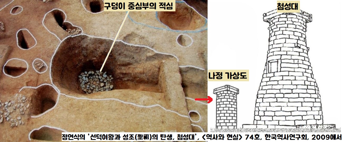 선덕여왕의 ‘성스러운 조상’이 박혁거세와 석가모니였다는 겁니다. 여성의 산도를 닮은 우물은 나정에서 보듯 박혁거세의 탄생을 상징한 거구요. 한편으로 첨성대는 석가모니의 탄생을 뜻하기도 한다는데요. 첨성대의 가운데 문(창구)은 석가모니가 태어난 마야부인(석가모니의 어머니)의 오른쪽 옆구리라는 겁니다.(정연식 서울여대 교수의 ‘선덕여왕과 성조(聖祖)의 탄생, 첨성대’, <역사와 현실> 74호, 한국역사연구회, 2009)