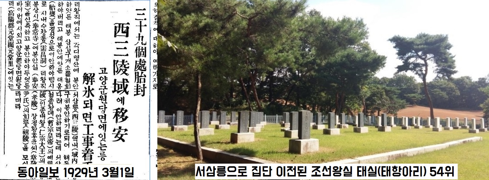 1929년 전국의 태봉 39곳을 훼철한 뒤 그곳에 조성되어 있던 태실 54위(주로 태항아리)를 경기 고양 서삼릉에 집단 이주시킨 겁니다. 무엇보다 일제는 새롭게 조성한 왕과 왕자(공·옹주 포함)의 공간을 한 일(一)자 형태로 구분했다죠. 멀리서 보면 일본을 상징하는 ‘날 일(日)’자 형태입니다. 지하도 원형의 시멘트 관에 태지석과 태항아리를 묻고 그 위를 날 일(日)자 형태의 시멘트 덮개를 씌웠습니다.
