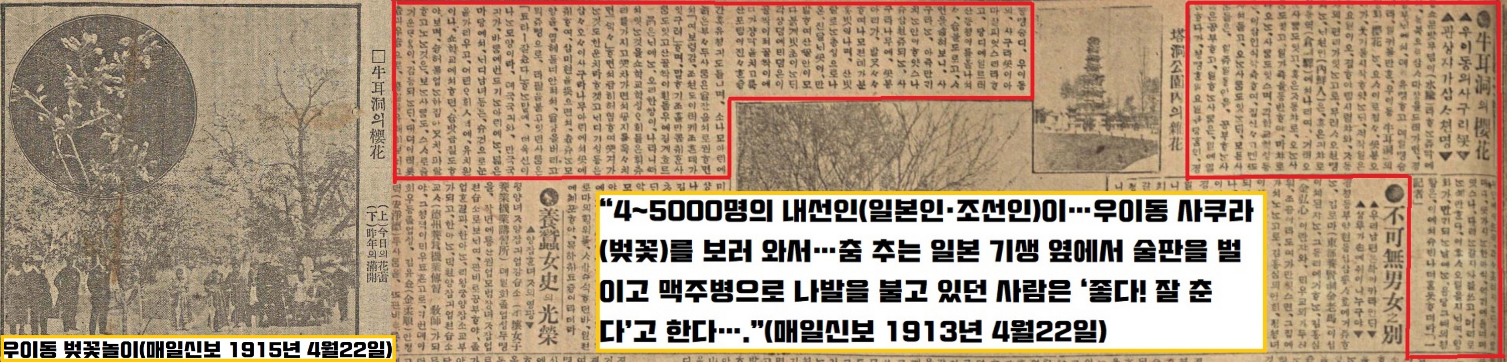 “4~5000명의 내선인(일본인·조선인)이…우이동 사쿠라꽃(벚꽃)을 보러 와서…춤 추는 일본 기생 옆에서 술판을 벌이고 맥주병으로 나발을 불고 있던 사람은 ‘좋다! 잘 춘다’고 한다…”.(매일신보 1913년 4월22일)