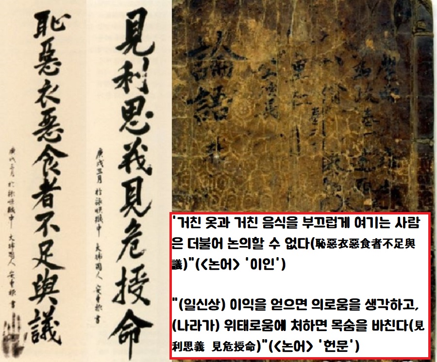 안의사가 인용한 중국 고전 중에는 공자의 <논어>가 유독 많습니다. 이중 ‘거친 옷과 거친 음식을 부끄럽게 여기는 사람은 더불어 논의할 수 없다(恥惡衣惡食者不足與議)’는 유묵은 <논어> ‘이인’에서 인용했구요. ‘(일신상) 이익을 얻으면 의로움을 생각하고, (나라가) 위태로움에 처하면 목숨을 바친다(見利思義 見危授命)’는 글은 <논어> ‘헌문’에서 따왔습니다.
