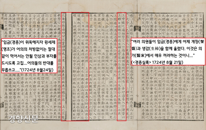 당시 소론은 경종(1720~1724)의 편에 서 있었고요. 노론은 경종을 압박해서 그들이 지지한 연잉군(영조)를 왕세제로 올렸습니다. 그런데 경종이 즉위 4년 만에 승하하는 과정에서 왕세제가 연루된 ‘시해음모설’과 ‘독살설’이 그럴싸하게 퍼집니다. 즉 왕세제(영조)가 경종의 와병 중에 상극의 음식인 게장과 생감을 올렸고, 막판에는 의사의 처방없이는 절대 같이 먹어서는 안될 인삼과 부자를 드시도록 고집했다는 겁니다. 그것도 어의들의 반대를 무릅쓰고….(1724년 8월21·24일)