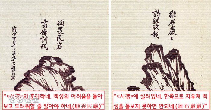 ‘유석암암(維石巖巖)은 <시경>에 실려있다네(詩經攸載)’, ‘고외민암(顧畏民巖)은 <서경>의 훈계라네(書傳訓戒)’라는 글귀를 담은 그림인데요. ‘유석암암’은 <시경> ‘절남산’, ‘고외민암’은 <서경> ‘소고’의 구절입니다. 요컨대 이런 내용입니다.