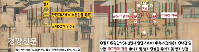 1785년(정조9) 12월 창덕궁 중희당에서 열린 친림 도목정사를 그린 ‘을사친정계병’을 보면 알 수 있어요. ‘도목정사(都目政事)’는 해마다 2~4차례 관리들의 인사고과를 토대로 승진·삭탈·자리 이동 등을 결정하는 일종의 인사위원회입니다.