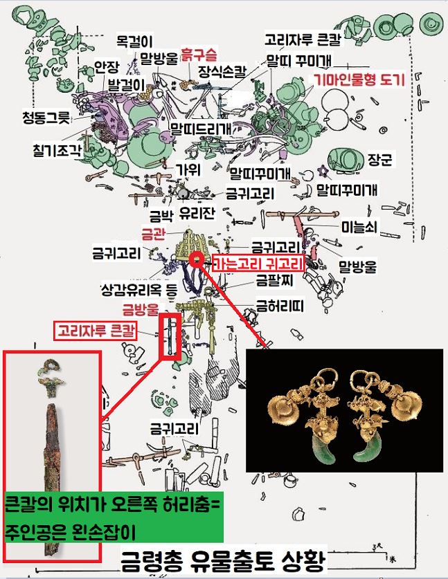 또 주인공이 누워있던 자리에서 노출된 각종 장신구로 몸집을 추정할 수 있죠. 그렇게 보니 금관과 금허리띠의 간격은 약 30㎝에 불과했습니다. 금허리띠와 발찌(구슬)의 간격 역시 30㎝ 였구요. ‘머리(금관의 장식 끝부분)-허리-발(발찌 추정 구슬)’을 잇는 장신구의 간격은 아무리 길게 보아도 90㎝ 정도를 넘지 않았습니다. 후하게 봐도 주인공의 키는 90~100㎝ 정도라는 얘기죠.