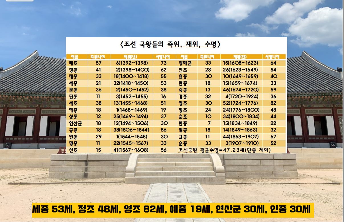 조선 국왕 26명(단종 제외)의 평균 재위기간과 평균수명은 18.63년(평균재위)과 47.23세(평균수명)입니다. 지금 기준에서 조선 임금들의 수명이 엄청 짧은 것으로 보이죠.