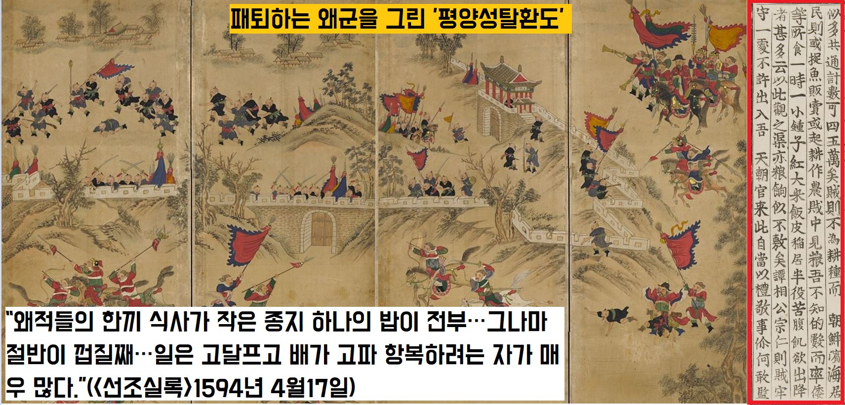 “왜적들의 한끼 식사가 작은 종지 하나의 밥이 전부인데, 그나마 절반이 껍질째였습니다. 일은 고달프고 배가 고파 항복하려는 자가 매우 많다고 합니다.”(<선조실록>)